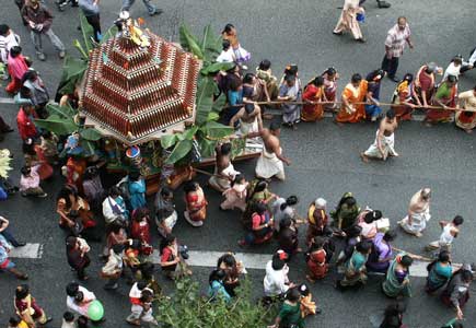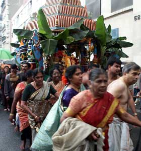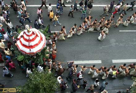 y de tejidos, lleva una estatua de bronce del Dios. (Esta estatua