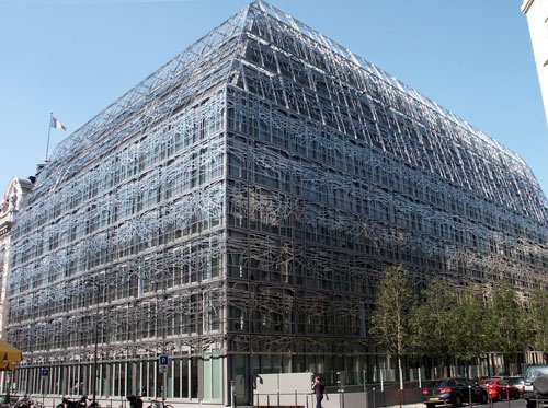 este edificio cuya fachada lleva una reja moderna muy curiosa.